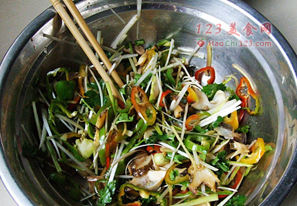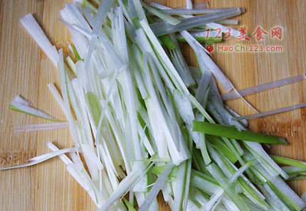 4、青红椒切丝;葱白切细丝。