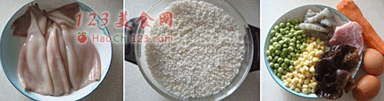 2、选用质地优良的细糯米,糯性强韧,蒸熟后可以把鱿鱼填充结实。