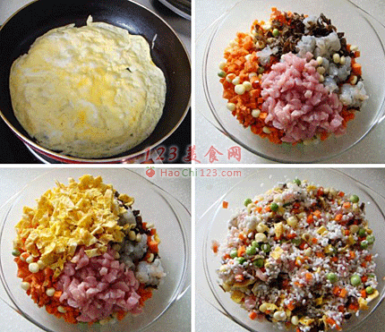 3、八种馅料可以根据自己口味调换,比如可以将木耳换成香菇,鸡蛋换成火腿等。