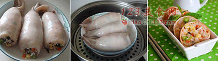 1、鱿鱼选中等个头的为宜,太大不容易蒸熟,小个儿的里面装不下多少馅料。
