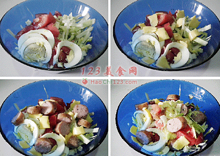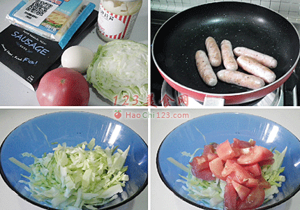 7、加入煎好的香肠。