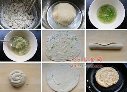 2、将葱切碎,放入一小碗中;油锅倒油烧热,趁热倒入放葱花的小碗中,在放入两勺低筋面粉和适量的盐搅拌均匀成葱油酥。抹油酥的目的是将烙好的饼分层明确而且松软。