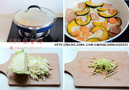 2、午餐肉可以换成自己喜欢的培根、火腿、五花肉。