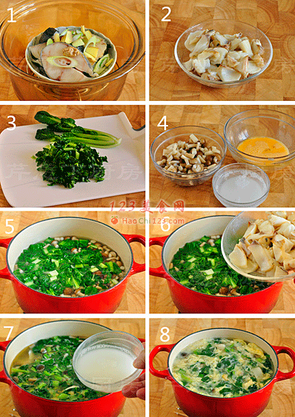 6、下入鱼肉和盐、胡椒粉以及芝麻香油,再次煮开。
