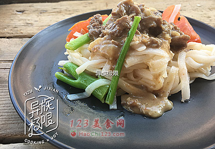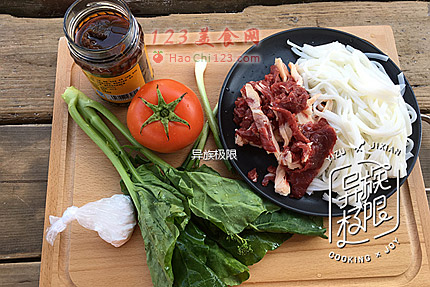 7、炒熟的牛肉片铲到装有粿条的盘中。