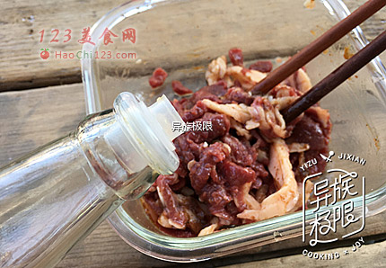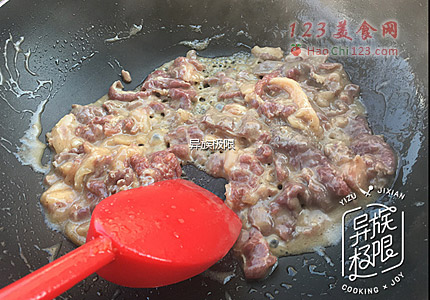 5、牛肉片入锅前加入少许的水和生粉;继续热锅热油,放入牛肉片。