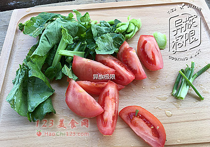 2、芥蓝菜和番茄洗净,芥蓝菜用手摘端,番茄切片。