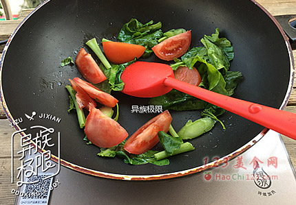 3、起锅,热锅热油,先炒熟芥蓝菜和番茄,加鱼露调味,盛出。