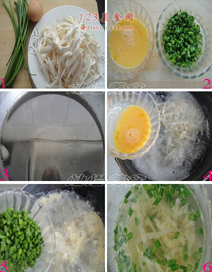 4、水开后,放入杏鲍菇丝,煮五分钟后,倒入蛋液。