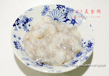 2、虾仁用盐抓洗后洗净充分沥干,加调料抓至起泡(可以加一点点蛋清一起抓,虾仁会更鲜嫩)。