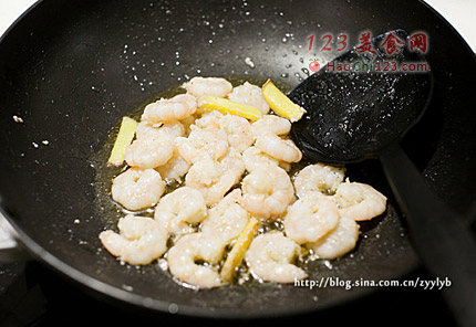 5、锅内多加些油烧热,姜片爆香后倒入虾仁翻炒至变色后马上关火(油要多一些,达到滑炒的效果,入锅时间也要尽量短,变色后马上关火盛出,保持虾仁的鲜嫩)。