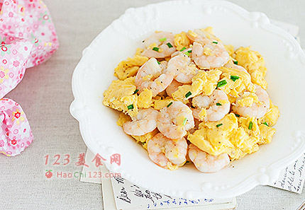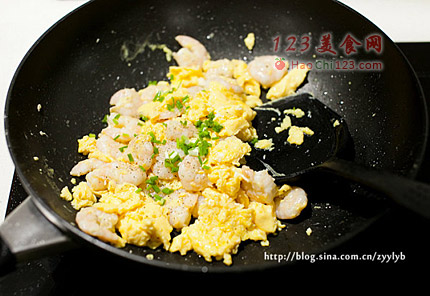 6、炒虾仁的油继续炒鸡蛋,鸡蛋末完全凝固前倒入虾仁并调入一点糖和黑胡椒炒匀,最后撒入葱花出锅(打鸡蛋的时候可以加一点点水,鸡蛋会更嫩,想要鸡蛋包裹虾仁,就早一些倒入虾仁)。