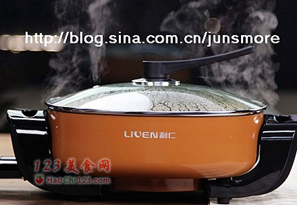 8、煮好以后,揭开盖,就可以吃了!吃的时候,可以切断电源将火锅端上桌,也可以用小火持续加热使它保持沸腾。