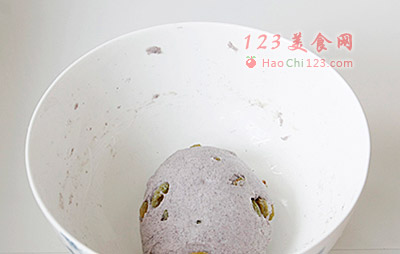 3、加入糖,面粉,搅散后用手揉合略成团,加入葡萄干(留几粒做表面装饰用),轻揉使之均匀分布于面团中。