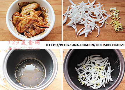 4、在电饭煲或电饭锅内胆里倒入1小勺香油,放入洋葱丝和姜丝,放上腌制好的鸡翅和蒜片,通电。