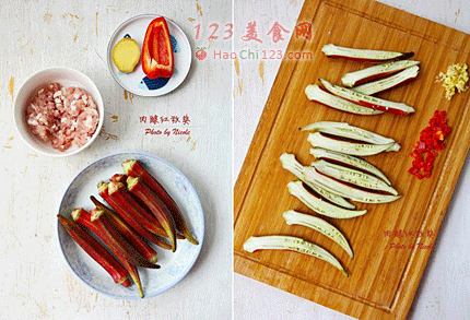 2、腌制好的肉馅酿入红秋葵。