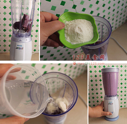 3、煮熟的紫薯放到搅拌机里,加入奶粉,清水,糖,开始搅拌啦!