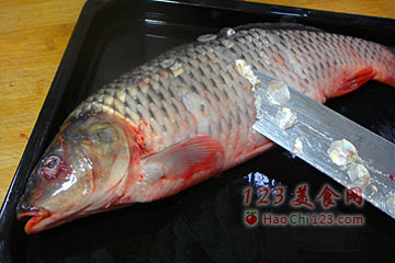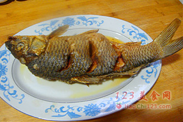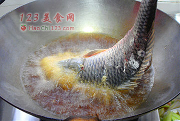 2、锅中做油6成热,直接下入带鳞的鲤鱼入锅炸制。