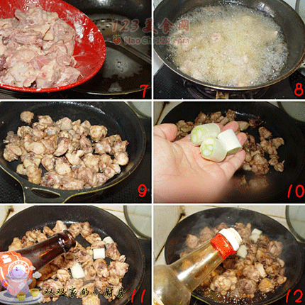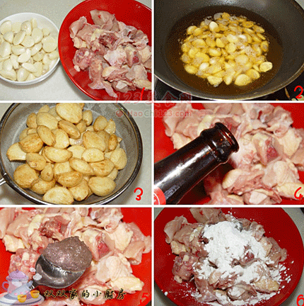 3、炸蒜的过程中,来处理鸡肉。鸡肉剁大丁,洗净控干水份,加入绍兴酒(图4)、虾酱一勺(图5),淀粉少许(图6),抓匀(图)。