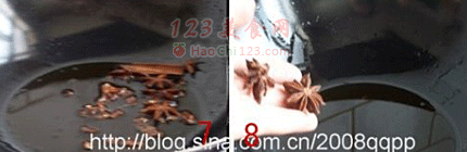8、关火,取出炸过的花椒、八角、桂皮不用,再重新开火放入八角2、3粒。