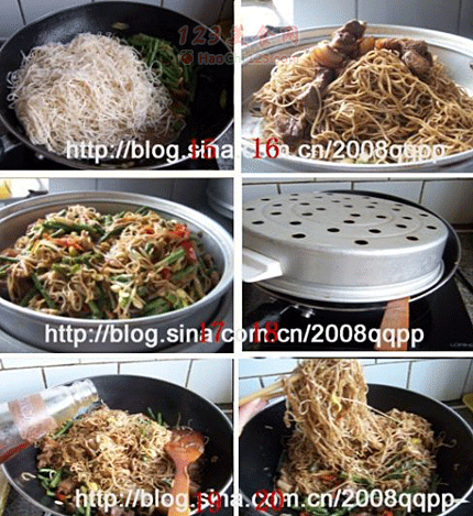 15、这时用7分钟蒸好的鲜面条即好,取出放入抄菜锅中。
