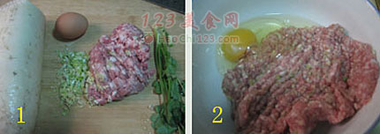 3、萝卜擦丝和搅好的肉馅。