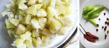 4、锅内注油,中小火加热,入香芹、花椒、干红椒翻炒,油温升高后捞出,转大火下3中的柚皮瓤丁,锅内加白醋少许,糖少许,老抽少许翻炒,加水(或高汤)盖过瓤丁面,煮开后转中小火,约5-6分钟后,加红辣椒油、胡椒粉少许、蚝油、盐,转大火翻炒收汁,起锅前加小勺香油。