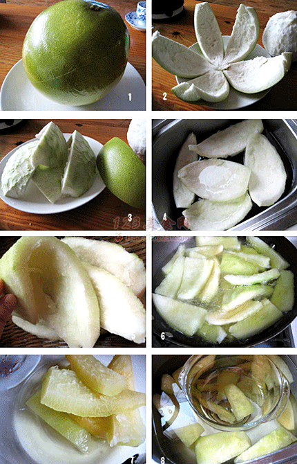 2、锅内坐水,用滚水将柚子皮滚煮10分钟左右(筷子能捅穿即可),然后捞起,凉水浸泡(换水2-3次)。