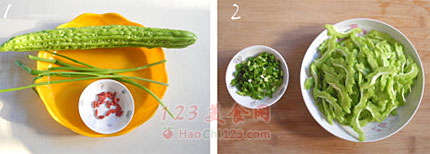 2、苦瓜洗净,从中间剖开,去瓤切片。小葱切碎备用。