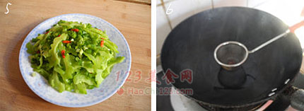 7、烧至七成熟时,迅速提锅将油淋到葱花上。