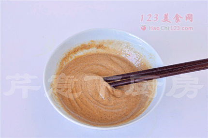 2、芝麻酱放入小碗,少量多次加入凉开水,搅拌均匀后再加下一次,直到芝麻酱解开,均匀粘稠光滑。