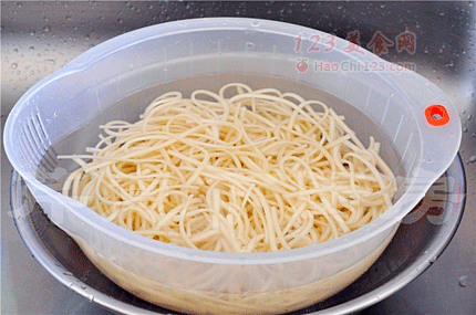 5、煮熟面条,如果吃凉面可用凉开水充分过凉,如果吃热面可用热水过一遍,口感更清爽。