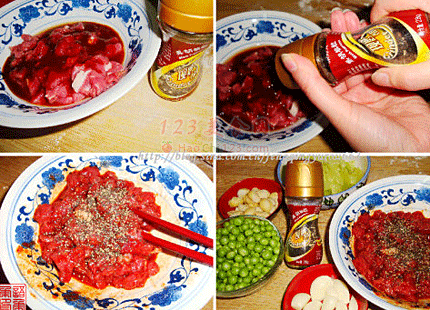 4、热锅凉油下洋葱、牛肉、豌豆、莴笋翻炒,加调料入味。