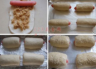3、把面团擀成椭圆形,洒上肉松,放上香肠,从上向下卷起接口处捏紧。放入铺有锡纸的烤盘。