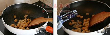 6、再倒入几滴白酒,翻炒几下后盛出备用。