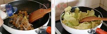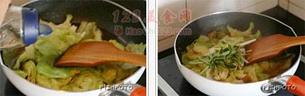 14、在出锅前撒入葱丝和香菜翻炒几下即可。