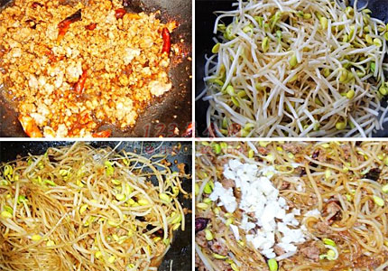 7、黄豆芽略微出水后,加入少量的水,放入粉条,小火炖。