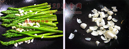3、锅里放少少油,烧热后,放芦笋、百合煸炒两分钟,出锅前放一点点盐,鸡精。放盘中并排摆好。